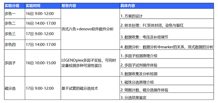 *注:請注意多色一、二、三、四為同一實(shí)驗,請根據(jù)自己的時間報名,請勿重復(fù)報名。上機(jī)實(shí)訓(xùn)多色實(shí)驗擬招40人,多因子實(shí)驗與磁分選實(shí)驗分別擬招10人。