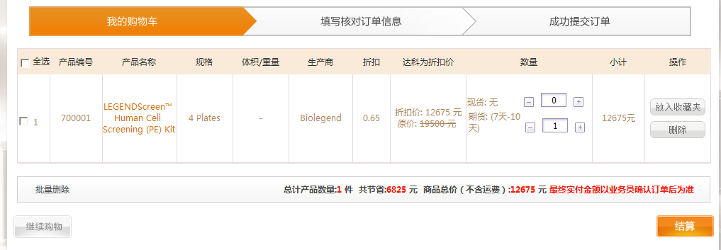 查看購物車,可以調整產品購買數量,結算下單,及返回購物。