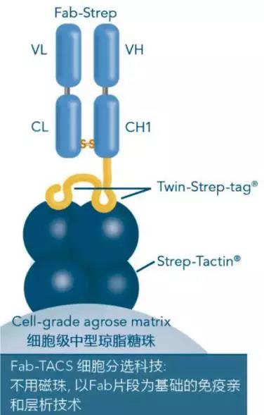 以Fab片段為基礎(chǔ)的無痕親和細(xì)胞分選技術(shù)(traceless affinity cell selection, Fab-TACS),由IBA Lifesciences根據(jù)其獨(dú)家的Strep-tag?/Strep-Tactin?蛋白純化系統(tǒng)發(fā)展而來。Fab-TACS運(yùn)用免疫親和層析的原理,利用細(xì)胞表面抗原分子CD marker與Fab片段的特異性結(jié)合來進(jìn)行捕捉及釋放目標(biāo)細(xì)胞。以不具磁性且可逆的試劑,取代一般具高親和力的完整抗體, 直接由全血或其他血液樣本來進(jìn)行溫和的標(biāo)準(zhǔn)化分選,因此能精準(zhǔn)的提供您不含標(biāo)記、未被活化的目標(biāo)細(xì)胞。