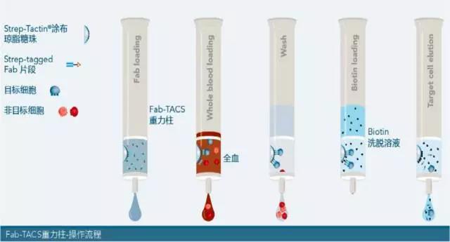 Fab-TACS重力柱內(nèi)裝有經(jīng)Strep-Tactin?涂布的細(xì)胞級中型瓊脂糖珠(cell-grade agarose matrix),如此一來,含有Twin-Strep-tag?的Fab片段(Fab-Streps)能與瓊脂糖珠結(jié)合。將全血或血液樣本加入重力柱,此時目標(biāo)細(xì)胞會與Fab-Streps進(jìn)行特異性結(jié)合,非目標(biāo)細(xì)胞則會直接流出。隨后,清洗重力柱將多余的非目標(biāo)細(xì)胞或血液雜質(zhì)洗去。最后,加入生物素(biotin)中斷Fab-Streps與Strep-Tactin?間的結(jié)合,與此同時,低親和力的Fab-Streps也會從目標(biāo)細(xì)胞上解離,而您便能獲得不含標(biāo)記、幾近原始的目標(biāo)細(xì)胞來進(jìn)行后續(xù)的實(shí)驗(yàn)。