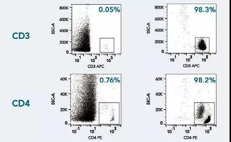 使用Fab-TACS細(xì)胞分選重力柱分離全血中的CD3+及CD4+免疫細(xì)胞。細(xì)胞樣本以CD3-APC (OKT-3)或 CD4-PE (OKT-4) 抗體染色后,進(jìn)行流式分析,左右分別為分選前后的細(xì)胞群分布。死細(xì)胞以DAPI染色先行排除,并使用不同F(xiàn)SC/SSC信號來排除雙粘體和細(xì)胞碎片。結(jié)果顯示:即使直接處理全血,F(xiàn)ab-TACS科技仍能分離出高純度目標(biāo)細(xì)胞。