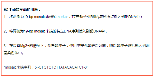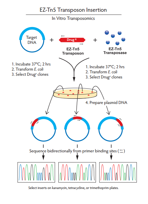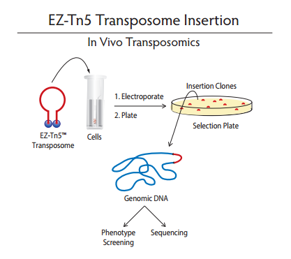 EZ-Tn5轉(zhuǎn)座子可在體外插入到含有靶DNA的載體。當(dāng)EZ-Tn5轉(zhuǎn)座子在沒有鎂離子孵育時,形成穩(wěn)定的EZ-Tn5轉(zhuǎn)座體復(fù)合體,可以被電擊進入活細胞,一旦進入細胞中,轉(zhuǎn)座體由細胞內(nèi)鎂離子活化,就能隨機插入到宿主的基因組DNA中。