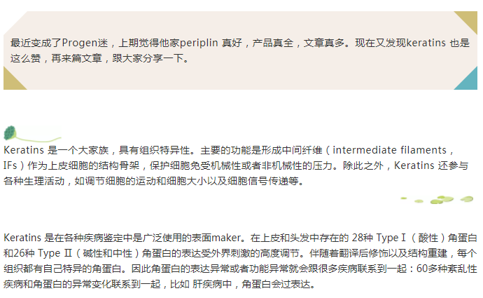 Progen可提供130多種Keratins抗體以及標(biāo)準(zhǔn)品, 抗體包括單抗、多抗,可用于IHC/WB多種應(yīng)用。