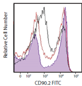 (將小鼠脾臟細胞分別用TruStainFcX TM PLUS(0.25μg/test,紫色填充直方圖),TruStainFcX TM(克隆93,1μg/test,紅線)封閉之后用CD90.2FITC染色,與未處理的小鼠脾臟細胞(黑線)作比較。結果顯示TruStainFcXTM PLUS封閉效果更優(yōu)。)