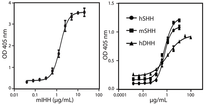 C3H10T1/2干細胞培養(yǎng)至細胞融合,使用BMP-9(20 ng/mL, Cat. No. 553102)和不同濃度的h/mSHH、或hDHH、或mIHH(Cat. No. 753502, 754602, 759802,758602)處理,將間充質(zhì)干細胞誘導分化為成骨細胞。使用對硝基苯磷酸酯作為底物,檢測成骨細胞標記物堿性磷酸酶。