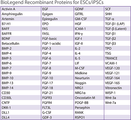 BioLegend提供多種重組蛋白,可幫助維持胚胎干細胞、誘導多能干細胞、造血干細胞、間充質(zhì)干細胞和神經(jīng)干細胞的多能性或誘導它們分化。下面我們一起了解一下重組蛋白在幾種干細胞中的應用。