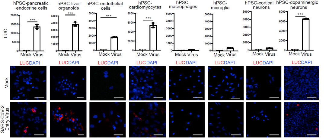 作者提出了一個(gè)由人類多能干細(xì)胞(hPSCs)的細(xì)胞和類器官組成的實(shí)驗(yàn)平臺(tái)。具有刺突結(jié)構(gòu)的假病毒可感染胰腺內(nèi)分泌細(xì)胞,肝類器官,心肌細(xì)胞和多巴胺能神經(jīng)元。最近的一些臨床研究表明COVID-19還與糖尿病關(guān)系密切。