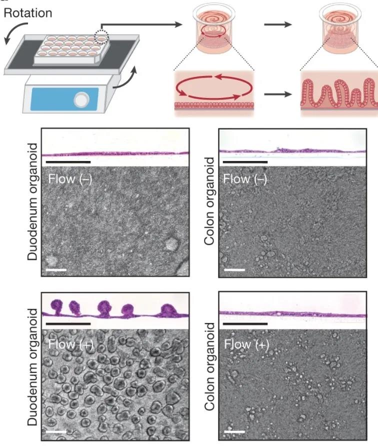 下圖為存在(+)或不存在(-)流動(dòng)的培養(yǎng)基的情況下培養(yǎng)四天的2D十二指腸和結(jié)腸類(lèi)器官的鏡下圖片。(蘇木精和曙紅染色)