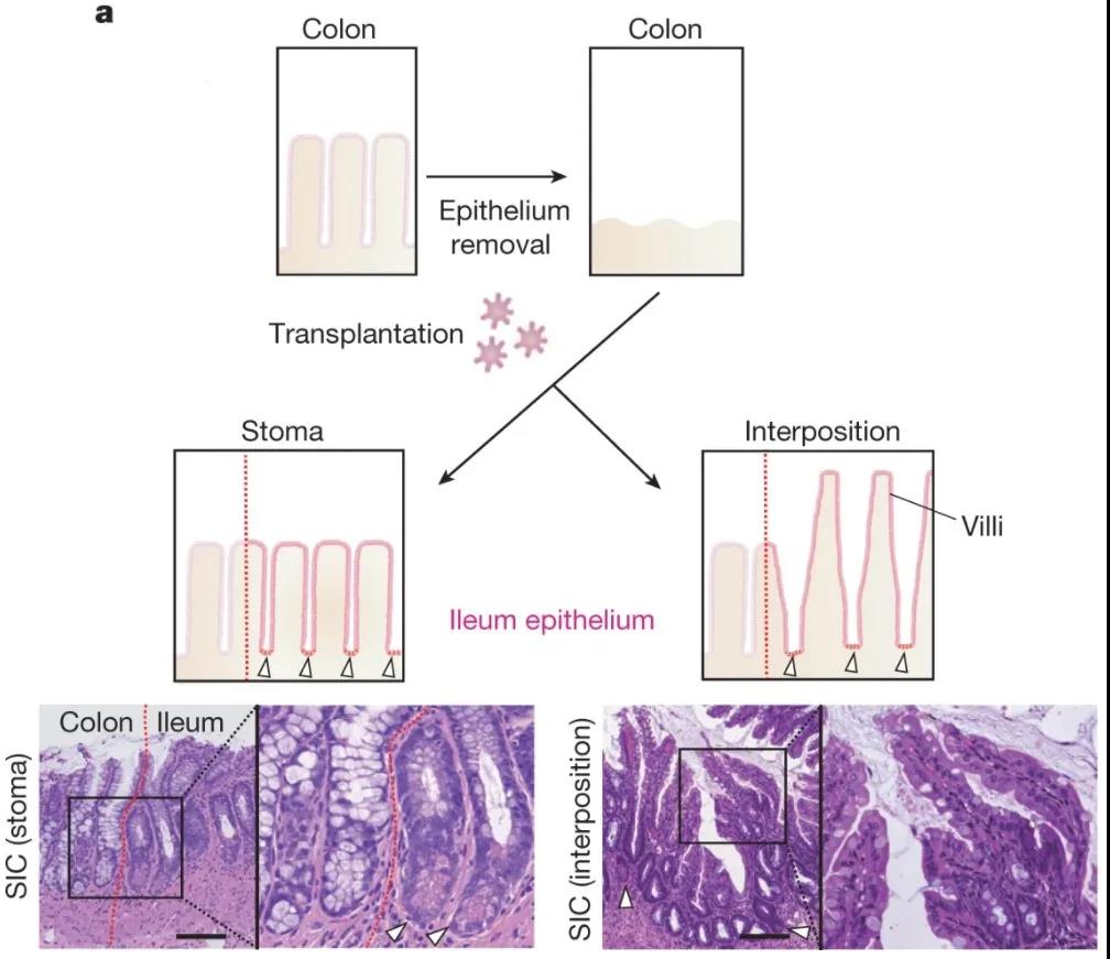 通過(guò)上皮置換產(chǎn)生SIC的策略。頂部,結(jié)腸上皮被去除(EDTA處理),然后回腸類(lèi)器官被移植。在進(jìn)行介入手術(shù)之前,移植的回腸上皮顯示出隱窩狀結(jié)構(gòu)(左下圖和圖像)。移植后,會(huì)形成絨毛狀結(jié)構(gòu)(右下圖和圖像)。白色箭頭表示潘氏細(xì)胞。