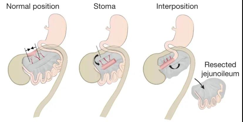 分兩步進(jìn)行的手術(shù)方法,用于在空腸的起點(diǎn)和回腸的終點(diǎn)之間插入需要移植的結(jié)腸類(lèi)器官。